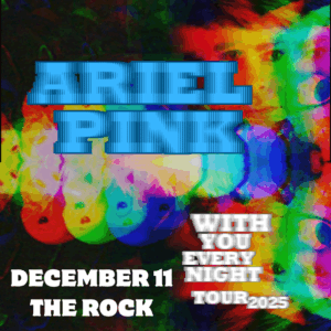 Ariel Pink When December 11, 2025 - December 12, 2025 7:00 pm - 11:59 pm Add To Calendar Download ICS Google Calendar iCalendar Office 365 Outlook Live Where THE ROCK 136 N. Park Avenue, Tucson, Arizona, 85719 Event Type Rock & Roll Concert, Live Music, Phenomenon Concerts, Rock Tucson, Tucson Nightlife Map Unavailable Phenomenon Concerts Presents Ariel Pink Thursday, Dec 11th , 2025 The Rock Tucson, AZ DOORS: 7:00 PM / SHOW: 8:00 PM ALL AGES Tickets $30/$35 TICKETS